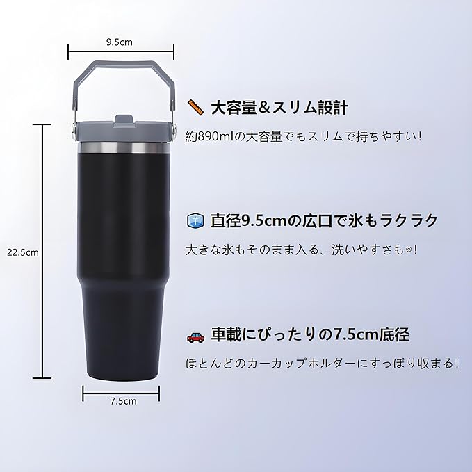 【錆びにくい良質ステンレス】MYEEDA タンブラー 蓋付き こぼれない ストロー付きタンブラー 890ml ステンレス 真空断熱 コーヒー タンブラー 大容量 魔法瓶 保冷ボトル おしゃれ 手を入れて洗える水筒 広口 長時間 保冷 タンブラー 持ち運び コンビニコーヒー tumbler 車 ドリンクホルダー対応 真空 coffee mug 保温保冷 漏れない 車用 断熱タンブラー (ブラック)