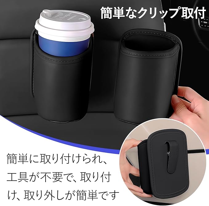 【クリップオン】:この大型車用カップホルダーは、金属製のクリップが内蔵されており、ほとんどのシートバックやドアポケットに邪魔にならずにしっかりと取り付けられます。クリップで留めるだけで使用できます。デコボコ道や急カーブでもしっかりホールド。