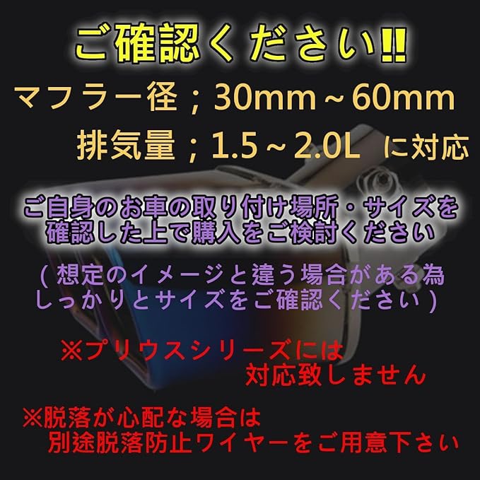【注意事項】取付対応サイズ 装着可能マフラー取付部分サイズ →30㎜Φ~60mmΦ 排気量制限→1.5-2.0Lの乗用車に対応できます。これ以上の排気量車種は適合不可となります。汎用タイプなので取付直径、バンパーの干渉などが問題なければ取付可能です。取り付け部分の詳細のサイズをしっかりと事前に確認の上ご購入の程宜しくお願い致します。サイズが合わない場合は取り付けが出来ませんのでご注意の程宜しくお願い致します。その他事前にサイズの確認をしないと想定のイメージと違う場合がございますのでしっかりとご確認の上ご購入の程宜しお願い致します。しっかり締め付ければ脱落リスクは減りますが、心配な場合は別途脱落防止ワイヤーをご用意ください。またプリウスシリーズに関しては不適合となります。ご注意の程宜しくお願致します。【パッケージ内容】 デュアルマフラーカッター1個 【サイズ】約190x158mm 【入口内径】63mm 【重量】473g 【素材】最高の耐久性を実現する高強度ステンレス鋼製