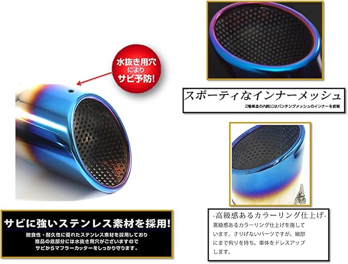 迫力の スラッシュカット /シングルタイプの マフラーカッター です。 ✅ チタン焼 入色調のため、 リアエンド の ドレスアップ パーツ として 演出してくれます。 ✅ 取り付け方法も既存のマフラーにはめ込こみ、 ステー を ボルト で締め付けるだけで簡単に装着可能となっています。 ✅ 本体には 錆 予防用穴が付けてありますので、雨天運転の時に水を抜くのを加速することにより、従来型より錆びにくくなります。 ✅ 後付け感をかんじさせないドレスアップが可能です。