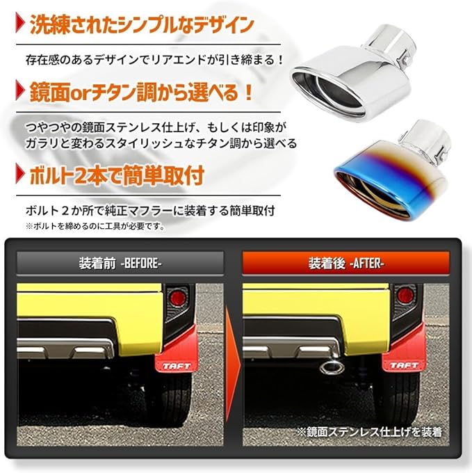 【専用設計で美しいフィット感】 タフト専用に設計されたマフラーカッター。 違和感のない一体感で、純正のような仕上がりを実現。リアビューを上質に演出します。
