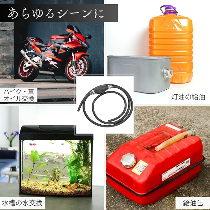 電源不要の手動タイプで、軽量なため持ち運びも便利です。水槽の水交換やボートのオイル交換、灯油ポンプなど、ちょっとした作業に最適です。手元に1つあると大変役立つアイテムです。