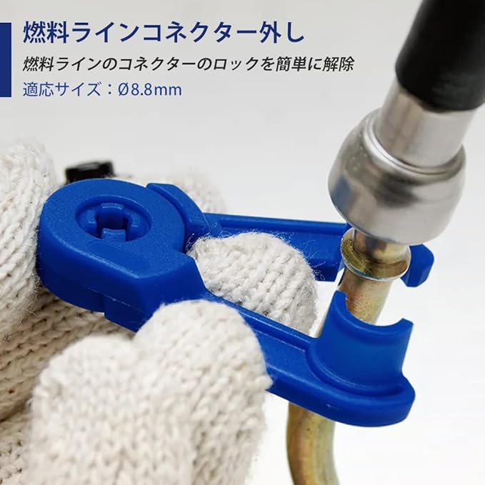 【燃料ラインコネクター外し】燃料ラインのコネクターのロックを解除する工具です。 本製品で燃料ラインを挟み、コネクター部に押し込むとロックを解除できます。 適応サイズ:φ8.8mm