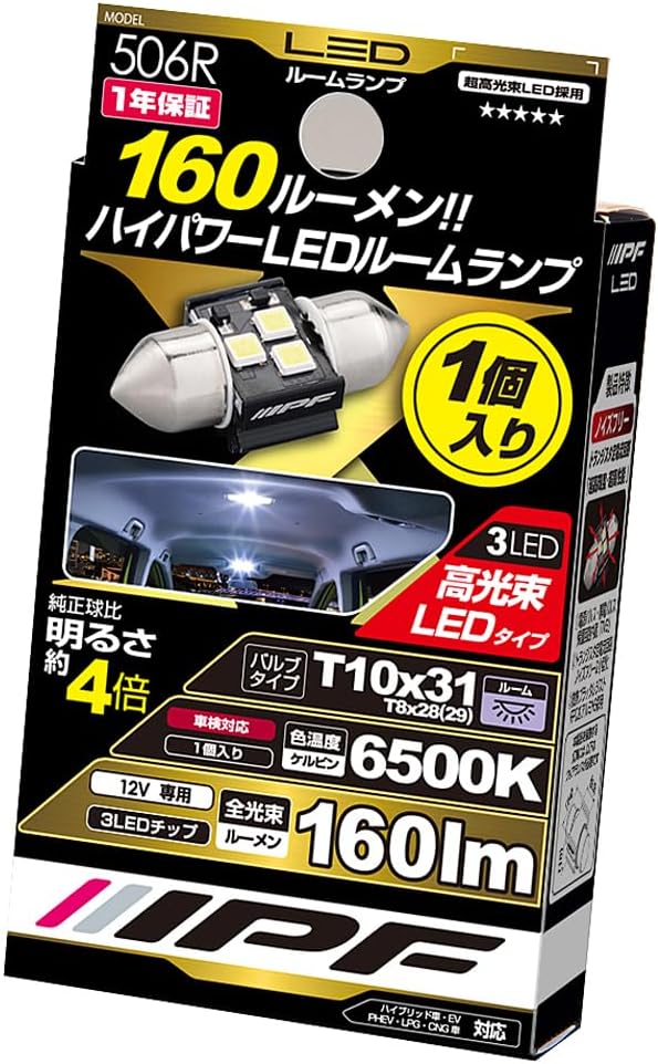 IPF ルームランプ LED 車用 T10 31 T10 28 160lm 6500K ホワイト 12V用 1個入 ハイパワー 高輝度 新設計回路内蔵 506R