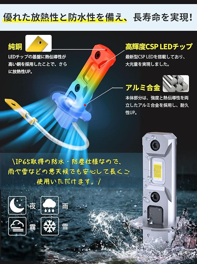 【優れた放熱性&高い防水性】熱伝道率の高いアルミニウム合金で明るさと寿命を維持 ・電圧の変化しやすいアイドリングストップ車やハイブリッド車でも安心してLEDを安定して大光量でご使用いただけます。バルブ内部には温度センサーを内蔵していますのでLED素子の破損を防ぎ長寿命で故障が少ないです。 高い防水性能で、水濡れで壊れた心配がありません!雨の日も安心です!