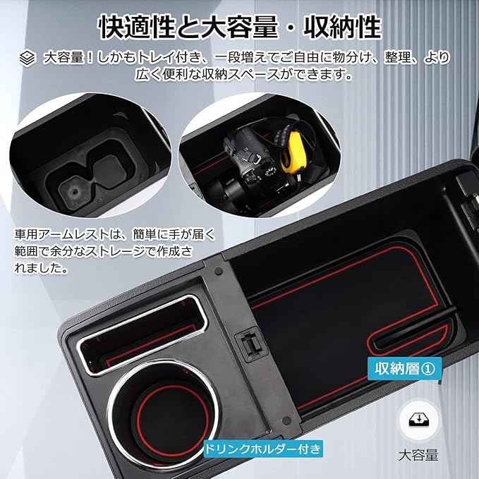4.【ジムニー収納には最適】:ジムニー専用アームレスト*1、内部トレイ*1、マット*3。肘掛けとしてだけではなく、傘や水、コインや鍵などを入れる大容量収納ケースとして使え、車内をキレイに!さらに、実用性と快適性を両立させており、お手軽いに想像以上のドレスアップ効果をもたらします。
