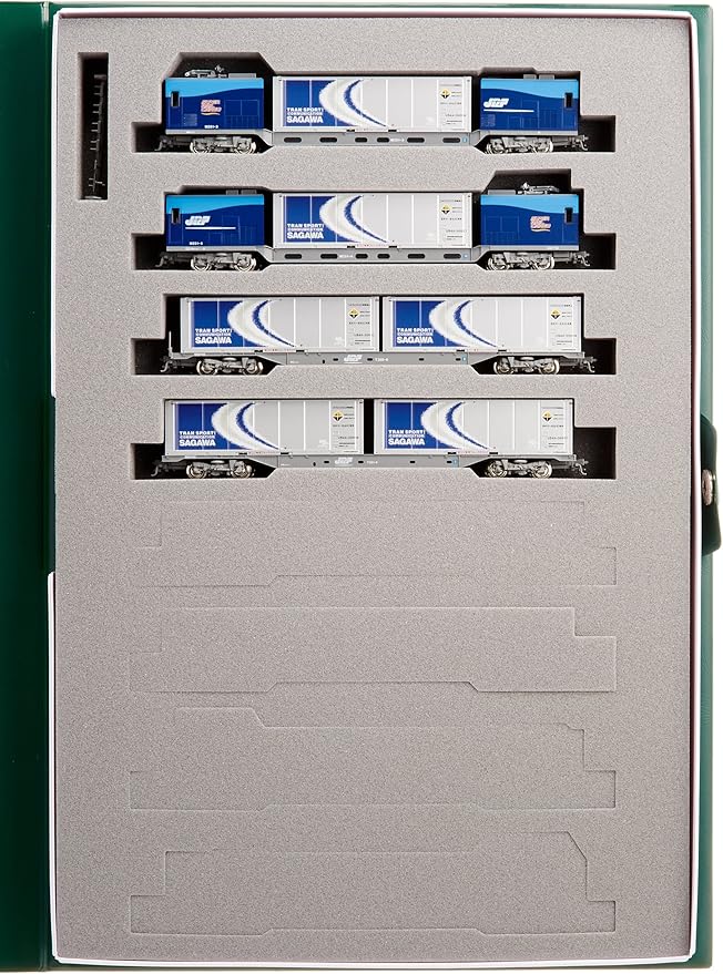 M250系専用の31フィートコンテナU54A形をリアルに再現。車両への着脱も可能。 JR貨物M250系の第2~第3編成 (登場時)の仕様をプロトタイプに模型化。グレーの下回りに、ライトブルーとダークブルーを配した爽やかな車体塗色を美しく再現。車体側面に表記されたスーパーレールカーゴマークを、美しく表現。車体ナンバー、車体表記を車体に表現済み 。4両増結セットは基本セットが収納可能な8両ブックケースを採用しておりますので、編成を8両に増やした場合でもスッキリ収納が可能です。