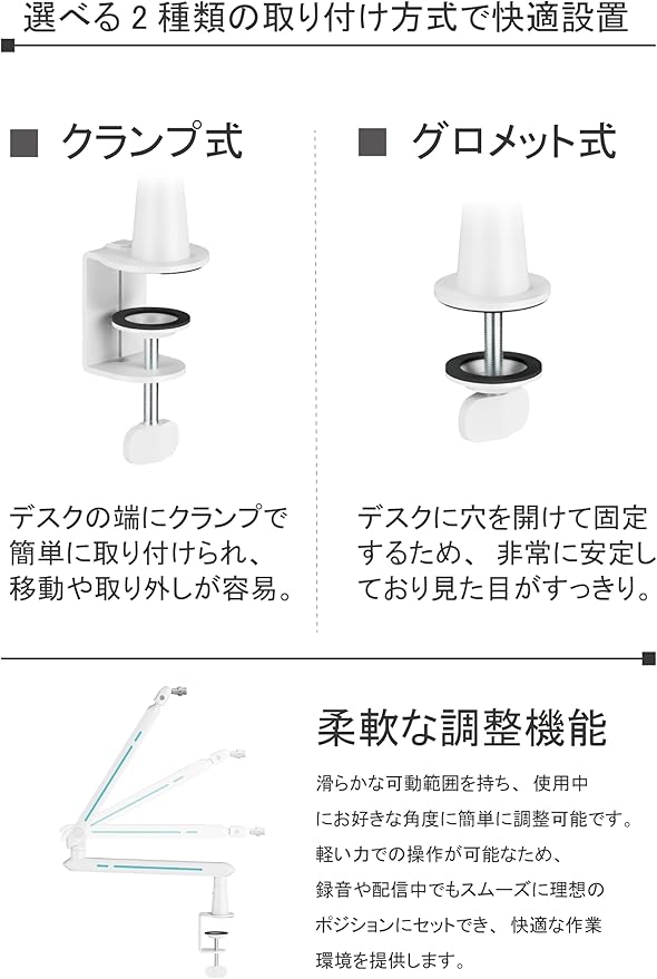 簡単な取り付け::クランプ式でデスクにしっかりと固定できるため、設置や取り外しが簡単で、場所も取りません。これにより、安定性を保ちながらマイクを使用できます。