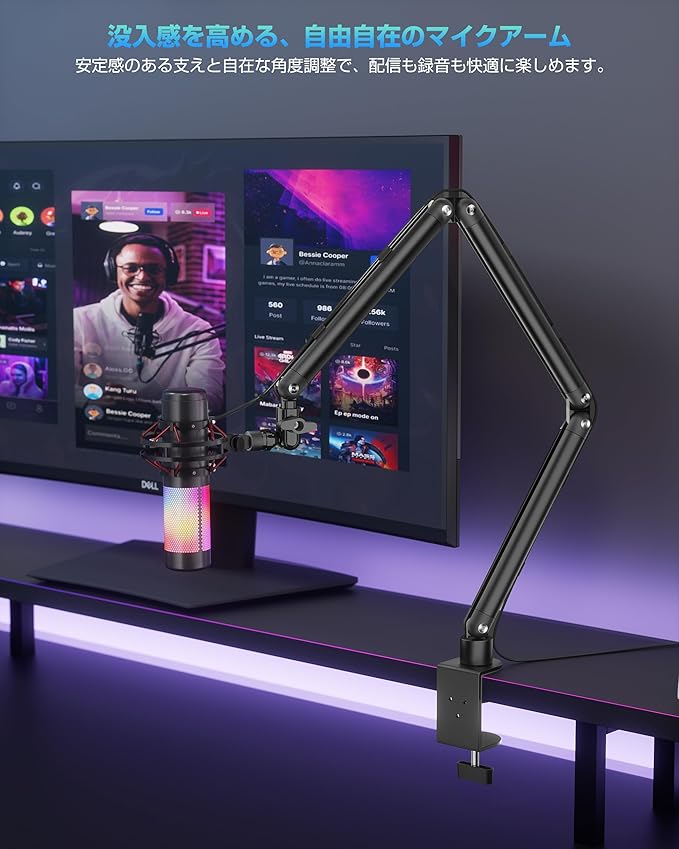 【可動域が広く、角度自由調整】本製品は8つ関節があり、可動領域が広いのスタンドとして、お好みの向き、高さを調節することができます。どんなに曲げでも安心してご利用いただけます。デスクを広く使ったり、マイクを見やすい位置に移動できたり、作業効率が上がります。折りたたみ式で、省スペースと実用性アップ! 収録、動画配信、生配信、オンライン授業、カラオケ、ギター、ドラム、ピアノ、宅録などに大活躍です。