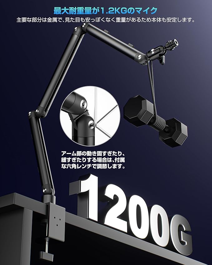 【安定性抜群・耐荷重1.2kg】従来品の購入者の声によると、今回のアームスタンドは六角レンチで締める仕様を採用し、耐荷能力も高めました。安定力も徹底的に強化され、揺れもなく安定して使用できます。付属のレンチで締めて重量が1.2kgまでのマイクに耐えることができます。