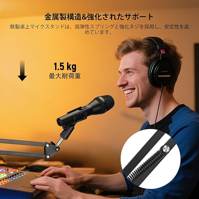 【金属製構造&強化されたサポート】卓上マイクスタンドは鉄製で、高弾性スプリングと強化ネジを採用され、最大1.5kg優れた耐荷重性を実現し、スプリングとスタンド自体の使用時間を延ばします。
