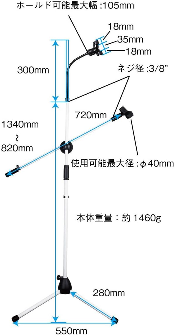 商品紹介 スマホスタンドと、マイクスタンドがひとつになったスタンドです。スマホスタンド部分はグースネックになっており、お好みの位置に手軽に自由に調節可能。 楽譜やコードを確認したり、ライブアプリでライブ配信の際マイキングと撮影をこれ一本で行えます。 マイクのブーム部は上下調節も可能なので、アコースティックギターのマイキングはもちろん、ボーカルマイクとしての使用も可能です。本体重量1460gと非常に軽量。高さは820~1340mmと多くのシチュエーションで活躍します。マイクホルダーは幅広いマイクに使用可能なクリップタイプを付属。ご家庭での使用も想定し、床を傷つけにくいソフトな足キャップを装備しています。 安全警告 設置の際は三脚の向きと重心バランスにご注意ください