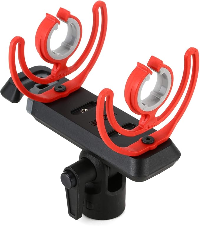 ガンマイクをブームポールに取り付けるためのショックマウント。5/8 インチネジ穴になっています。3/8 インチ用アダプターが付属しており、R DE 製ブームポールへの取り付けが可能です。マイク保持部はRycote 製Lyre ショックマウント。