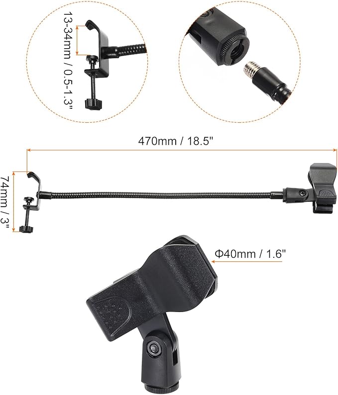 仕様: 全体サイズ: 470 x 74 mm (長さ*幅); チューブ外径: 10mm ; 雄ねじサイズ: 3/8"; マイクスプリングクリップ開口部幅: 40 mm; マイク クリップサイズ: 12mm~34mm ; 材質: 金属; カラー: 黒; 梱包内容: グースネックチューブ x 1; クリップ x 1; マイクスプリングクリップ x 1; 3/8"~5/8"マイクアダプター x 1。