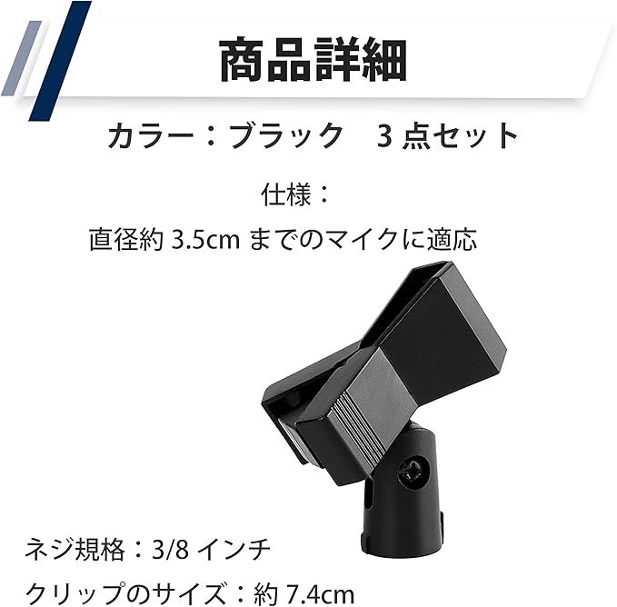 セット内容:3点セット ネジ規格:3/8インチ クリップのサイズ:約7.4cm 仕様:直径約3.5cmまでのマイクに適応 カラー:ブラック ※モニターの環境等により、色の見え方に若干差が生じる場合がございます。
