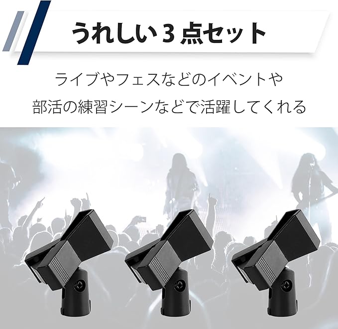 うれしい3点セット:クリップ式のマイクホルダーが3点揃ったセット品をご用意しました。ライブやフェスなどのイベントや、部活の練習シーンなどで活躍してくれることでしょう。