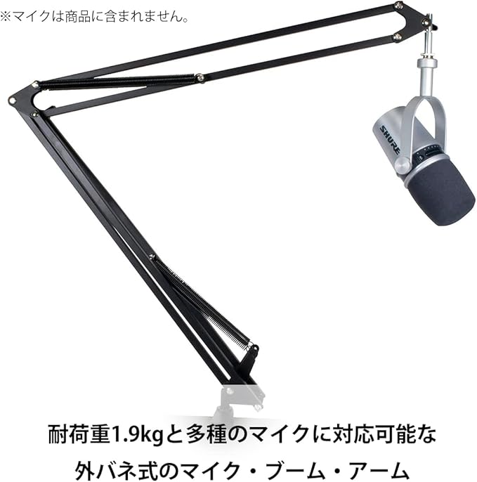 可動域が広く、耐荷重も 1.9kg あり多種のマイクに対応します。