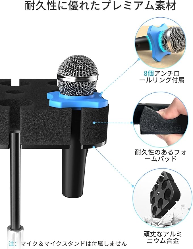 【マイク保護機能】軽量アルミニウム製のマルチマイクホルダーはマイクを確実にサポートし、各スロットの滑り止めシリコンパッドでマイク表面を傷から守ります。壁掛けオプションでマイクをしっかり固定しつつ、床面積を有効活用できます。