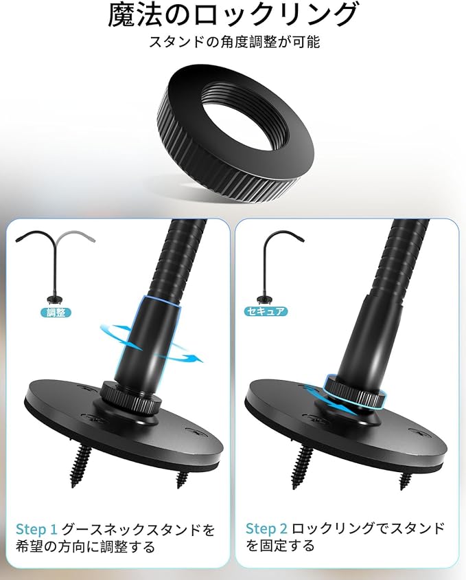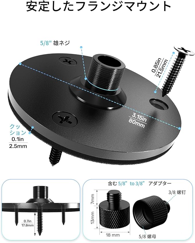 【内容物】アルミニウム合金製デスククランプ付き 13 インチグースネックマイクアームスタンド 1 点、3/8→5/8 インチネジアダプター 1 点、最大直径 1.35 インチハンドヘルドマイク固定用ホルダー 1 個を同梱します。デスククランプには 1/4 インチ穴が 2 つあり、1/4 インチネジで壁に取り付けることができます(ネジは含まれていません)。