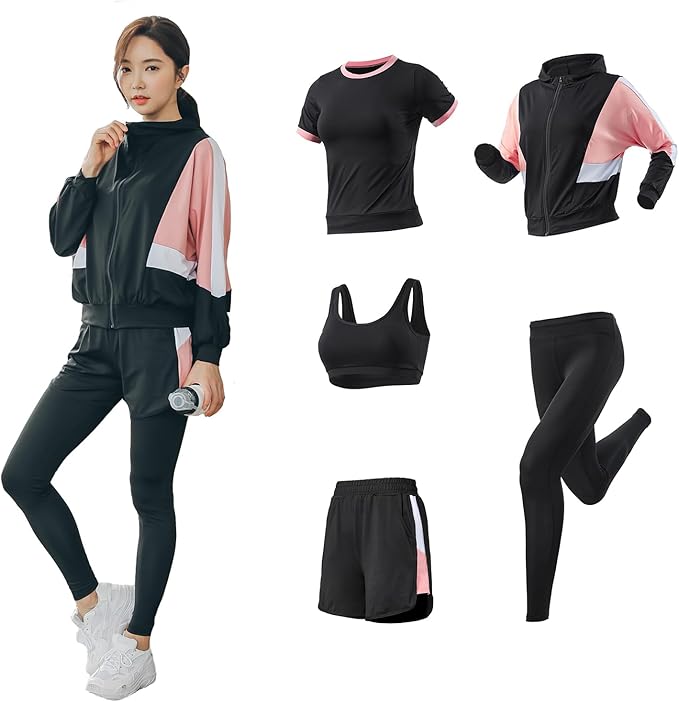 [DawnRain] スポーツウェア レディース ヨガウェア トレーニングウェア ランニングウェア 上下 5点セット 伸縮性 通気 吸汗速乾 フィットネス ジャージ スポーツブラ ロングタイツ パーカー 半袖 短パンツ 春夏秋冬 | LEAD-SHOP