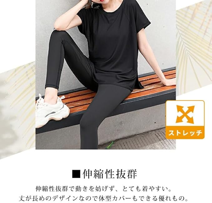[DAYCLOSET] ヨガウェアトップス ヨガtシャツ レディース 半袖 体型カバー 速乾 薄手 丈長め 伸縮性 ゆったり yoga125