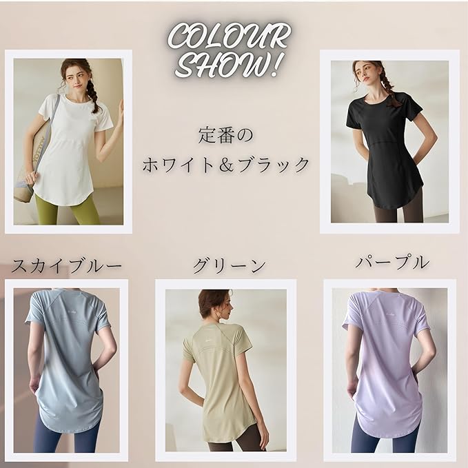[W&C] ヨガウェア トップス 体型カバー ロング丈 半袖 冷感シャツ レディース 無地 ゆったり 運動着 トレーニング スポーツウェア 薄手