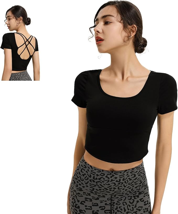 [MORGEN SKY] ヨガウェア トップス プラクティスシャツ 半袖 レディース カップ付き ショート丈 ストレッチ 通気性 美背 インナー トレーニング ヨガ ピラティス ダンス バレエ テニス フィットネス YD075 | LEAD-SHOP