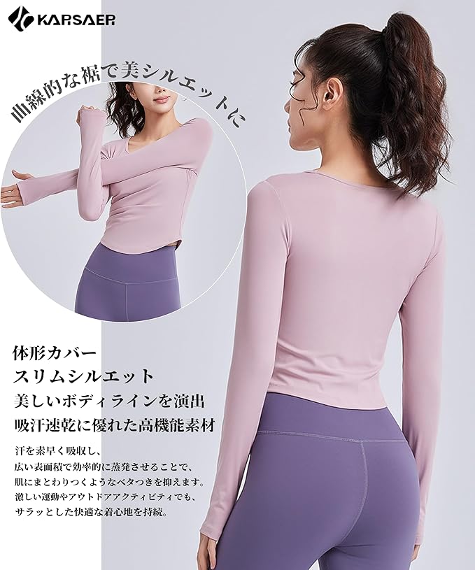 [Karsaer] ヨガウェア レディース 長袖 トップス カップ付き 指穴付き Tシャツ ストレッチ スポーツウェア 体形カバー 吸汗 速乾 通気 揺れない フィットネス トレーニング ヨガ プルオーバーA0067 | LEAD-SHOP