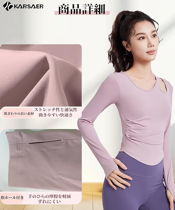 [Karsaer] ヨガウェア レディース 長袖 トップス カップ付き 指穴付き Tシャツ ストレッチ スポーツウェア 体形カバー 吸汗 速乾 通気 揺れない フィットネス トレーニング ヨガ プルオーバーA0067