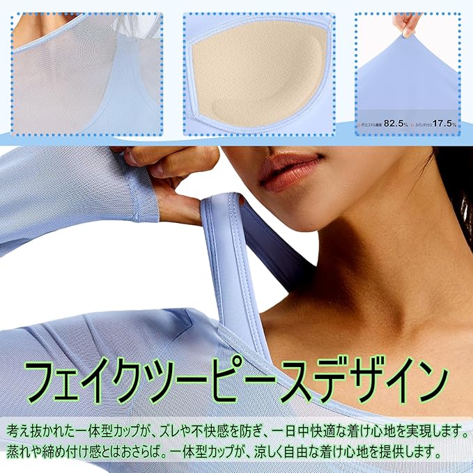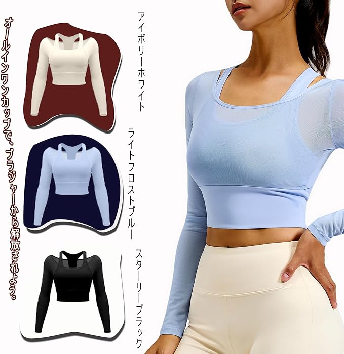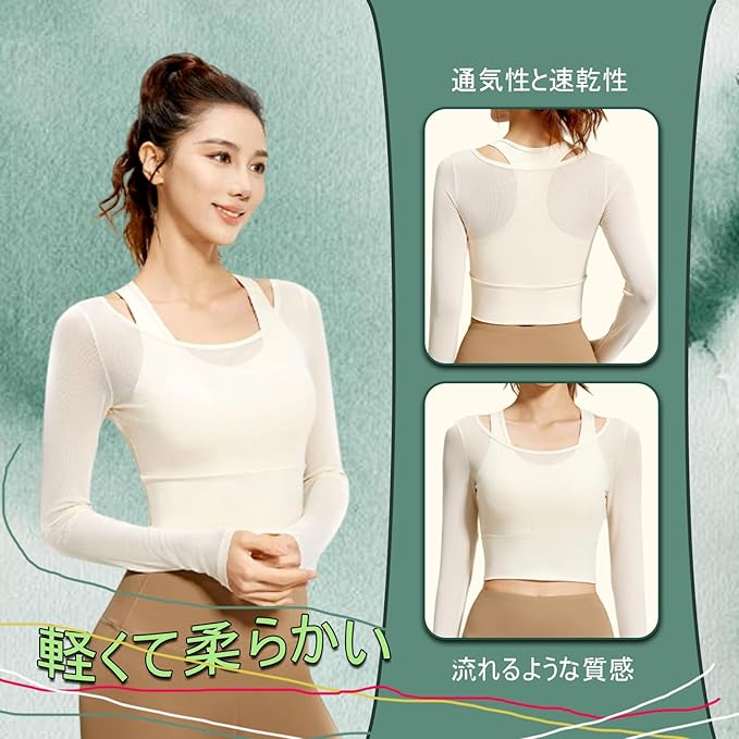 [Yodilala] メッシュパネルレイヤードトップ フィットネス スポーツ ピラティスワークアウトウェア カップキ長袖ヨガシャツ 吸汗速乾