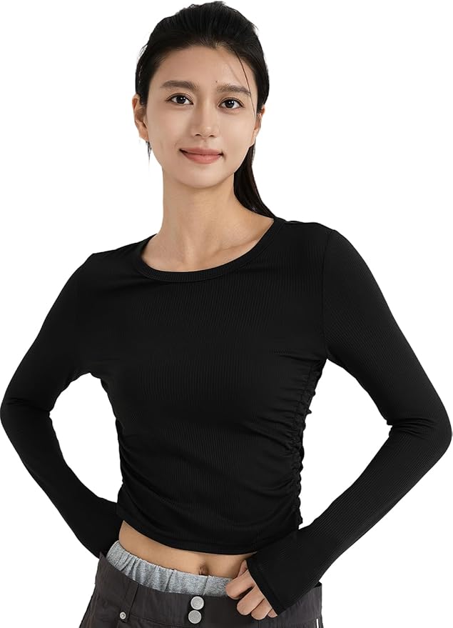 [MORGEN SKY] ヨガウェア レディース 長袖 Tシャツ トップス Uネック ショート丈 サイドギャザー インナー スポーツウェア フィットネス トレーニング 吸汗 速乾 通気 おしゃれ ロングスリーブ プルオーバー CX10 | LEAD-SHOP