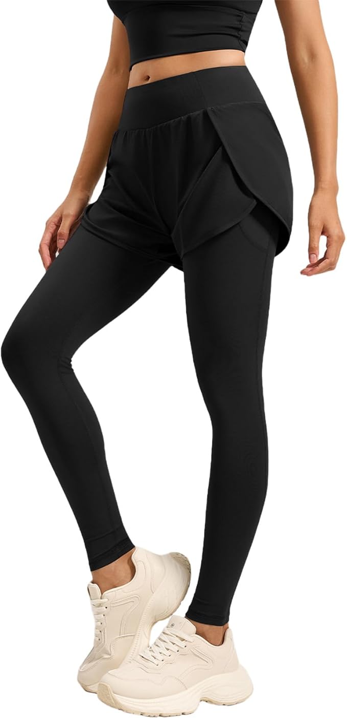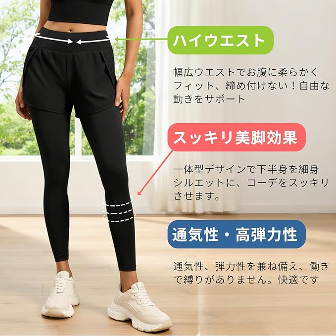[Tiricky] レディース ヨガパンツ ハイウエスト 偽二重デザイン サイドポケット 巻き上がり防止 美尻 ストレッチ 吸汗速乾 スポーツレギンス ピラティス