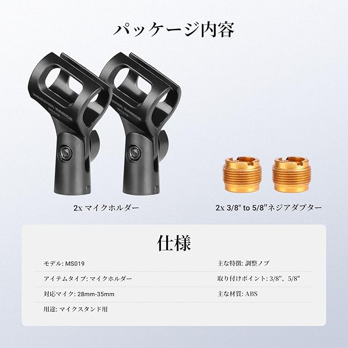 【パッケージ内容】2x マイククリップ、2x 3/8" to 5/8"ネジアダプター。