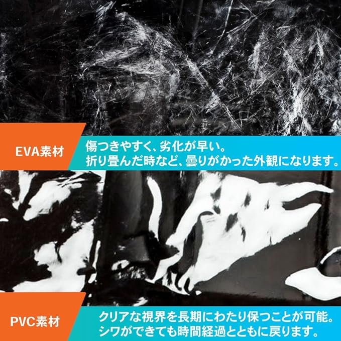 <シワができても元通り!クリア素材の特徴!>従来使用されている素材に比べ、最新素材は耐久性に特化し、新品感覚を長期で維持。お子様の視界を保つことに加え、扱い易さ、取付け時の外観もカバーするこだわり素材!