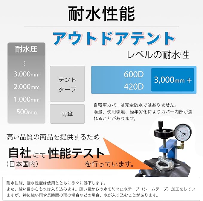 高い保護力と耐久性 | 丈夫で耐久性の高い厚手の420デニール生地を使用。密度もしっかりの125GSM。自転車用のカバーとしては上位クラスの丈夫な生地。自転車を守るのに最適です。