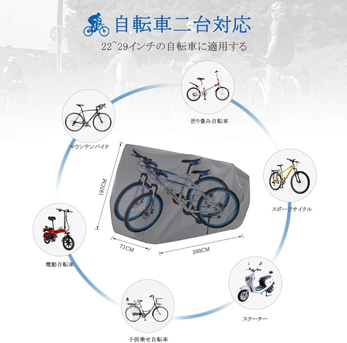 【自転車二台対応】自転車カバーのサイズは200x71x109CMですので、29インチ以内の自転車二台対応ことが十分です。大きいサイズなので、折りたたみ自転車からチャイルドシート搭載自転車まで使用可能です。