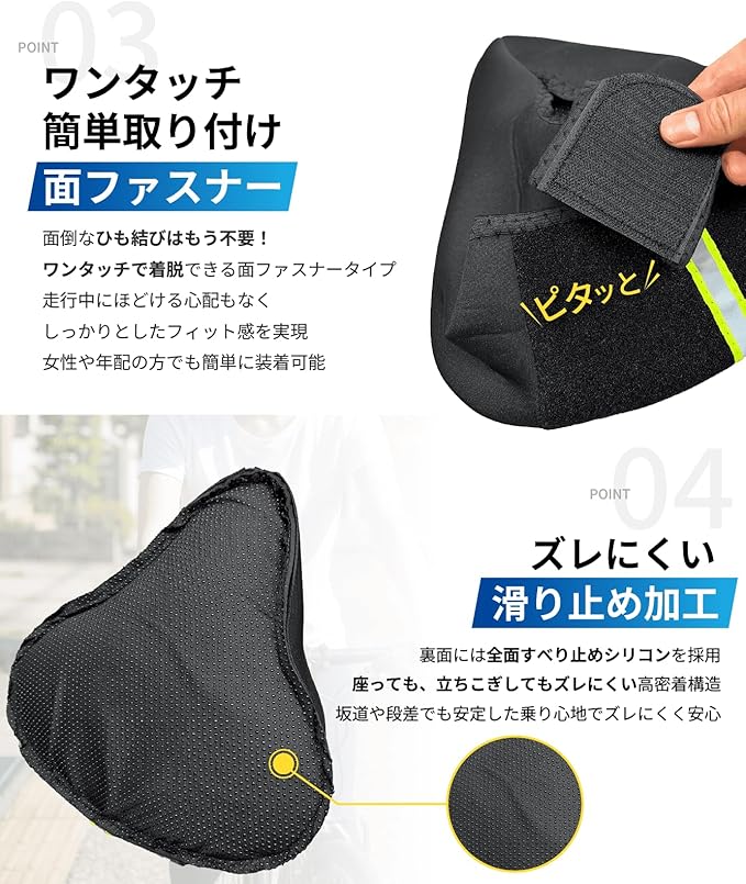 【ズレにくい滑り止め加工】裏面には全面すべり止めシリコンを採用。座っても、立ちこぎしてもズレにくい高密着構造。坂道や段差でも安定した乗り心地でズレにくく安心