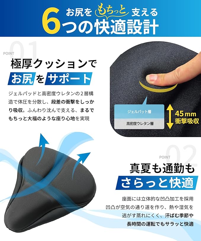 【痛くない超肉厚4.5cmクッションでもちっと衝撃吸収 長時間の走行でもお尻が痛くなりにくい、超極厚4.5cmクッション。クッションパッドと高密度ウレタンの2層構造で 体圧を分散し、段差の衝撃をしっかり吸収ふんわり沈んで、支える。まるで、もちっと大福のような座り心地を実現