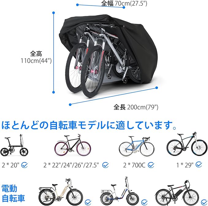 【汎用タイプ】大きめ約200 110 70cmで、ロードバイク・マウンテンバイク・クロスバイク・ママチャリ・シティバイク・ミニベロ・電動自電車など29インチまでのさまざまな自転車に対応できます。26インチまでの自転車2台を覆うことができる。