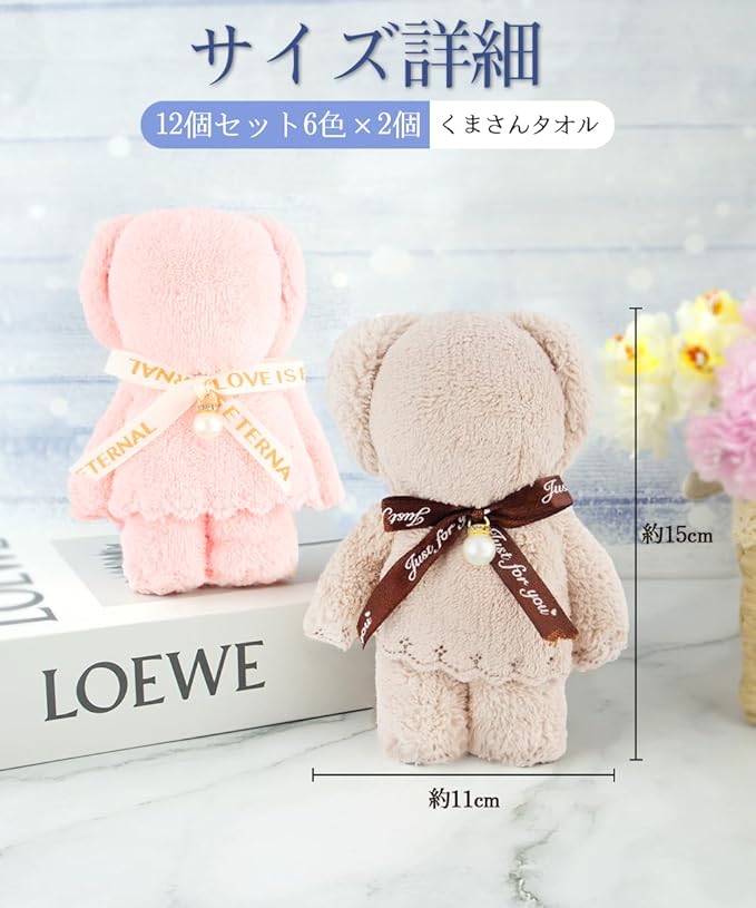 【商品内容】プチギフト ベアタオル 12個、opp透明手提げ袋 12個、メッセージカード 12枚【カラー】ホワイト、ブラウン、ブルー、ピンク、イエロー、パープル【サイズ】ハンカチサイズ:約29 29cm、クマさん本体サイズ:約15 11cm、手提げ袋サイズ:約15 20.5cm (持ち手部分約10cm)、メッセージカードサイズ:約6.8 9.8cm(※省スペース設計のため、透明袋にて表6個+裏6個の背中合わせ包装となっております。お手元に届きましたら、包装袋から中身を取り出し、全12個クマタオルとカードなど付属品をご確認いただきますようお願い申し上げます。)