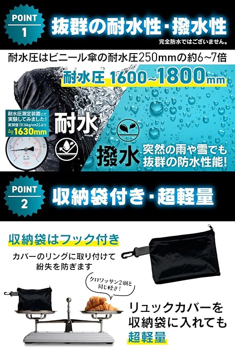 LAXELDリュックカバーは「十字ベルトでズレない!突然の雨や雪でも!濡れない!」突然の雨や雪でも抜群の防水性能!耐水性はMAX1800mmで「ビニール傘の耐水圧250mmの約6〜7倍」もございます。