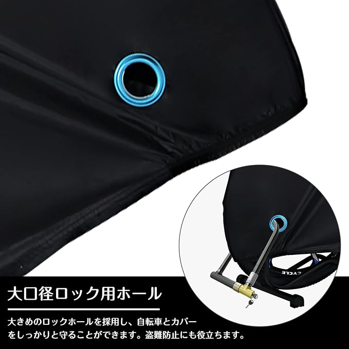 【盗難防止&風飛び防止】カバーの上から施錠できるよう、大きめのロックホールを採用しました。自転車とカバーをしっかりと守ることができます。さらに、ワンタッチバックルをスポーク部分に通して留めれば突風などが吹いても風飛びの心配ナシ!また、サイクルカバーの裾部分は絞りゴムになっているので、風によるカバーのバタ付きもある程度抑えることができます。
