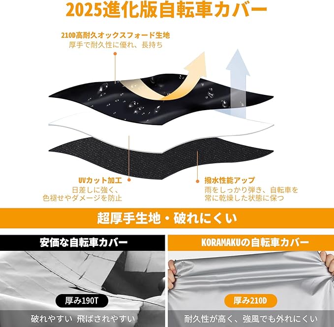 【革新的な高品質210Dオック生地な防水素材を】210Dオックスフォード生地を採用しており、ナイロン生地よりも厚くて丈夫で、破れにくいです。PUコーティング加工とダブルステッチ縫製技術により、防水性能が高く、雨、雪、氷、風、埃、直射日光など、さまざまな悪天候にも対応可能です。長時間使用しても漏水の心配がなく、大切な自転車をしっかりと保護します。