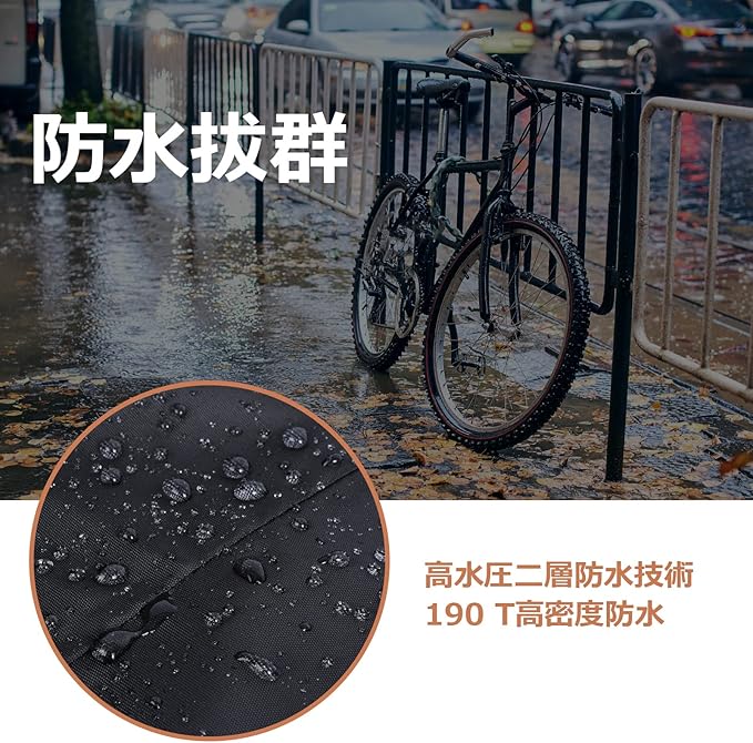 【盗難防止&高い撥水効果】前輪部分に盗難防止用のアルミ製ロックホールがあり、ロックはこの穴を通って自転車とカバーを一緒にロックすることができます。素材の表面には撥水加工が施されており、良好な防水性を実現しています。精密縫製を採用し、防水性能がさらに優れています。自転車カバーの防水効果は通常の約2倍です。