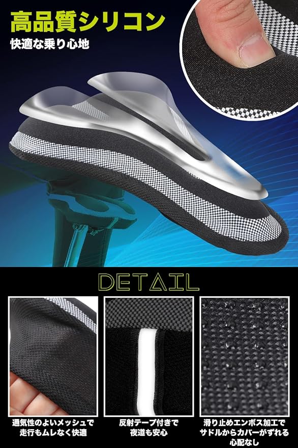 製品仕様 【保証】12か月保証【サイズ】サドル長:28cm/サドル幅:18cm/サドル高:3cm【材質】カバー:メッシュ素材/クッション:シリコン リバウンドクッション【カラー】ブラック ホワイト/ブラック ブルー/ブラック レッド※商品お届け時は、環境に配慮して、箱ではなく簡易包装にてお届けいたします。予めご了承ください。 防水機能はありませんので、屋外保管の際はサドルカバーを外すか、自転車カバーで水濡れを防いでください。