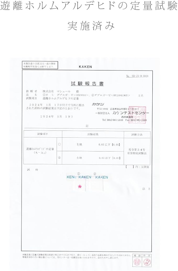 ノンホルマリン:遊離ホルムアルデヒドの定量試験済