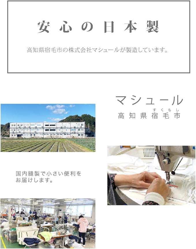 日本製。本製品は株式会社マシュール(高知県宿毛市)が製造しております。