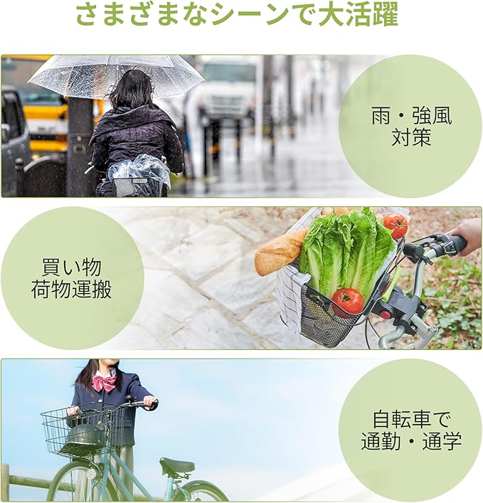 【多用途】突然の雨や雪でも中身をしっかり保護。ほこりや日差しからも守り、中身が見えない防犯対策にもなります。通勤・買い物に安心。