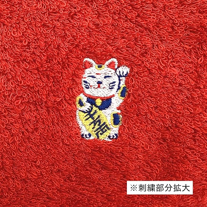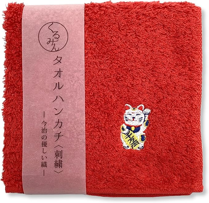 京佑 日本製 ハンドタオル 今治産 綿100% 約25 25cm 招き猫 赤 くるみん 和柄 lucky cat ねこ 刺繡 ハンカチ プレゼント ギフト 還暦 紙帯巻き
