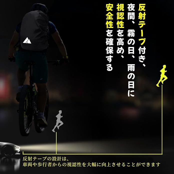 【反射材付き 安全確保】このバックカバーは厚い反射テープを採用しており、可視度の悪いところでも強い存在感を持っており、自身の存在を相手に知らせる防犯にもなり、なにより自身の身の安全を守ります。